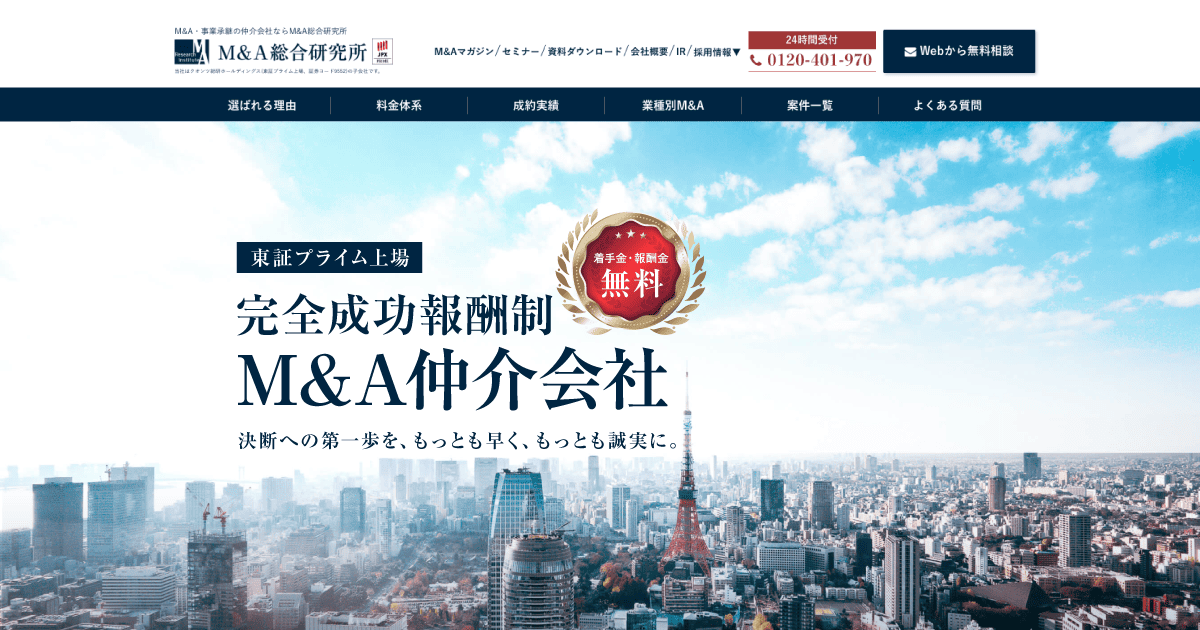 M&A総合研究所は譲渡企業様完全成功報酬制のM&A仲介会社です。売り手と買い手のマッチングを経験豊富なM&Aアドバイザーがフルサポートでお手伝いします。